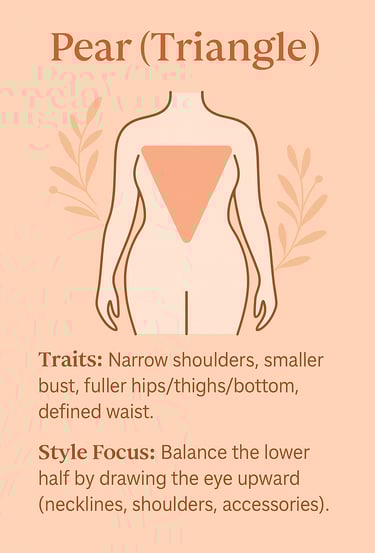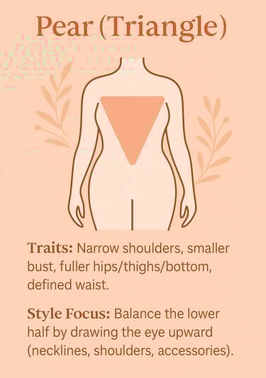 We’ll expand this post into a body-type hub with dedicated guides—pear, apple, hourglass, rectangle, and inverted triangle—each with visual charts for best necklines, sleeve shapes, hemlines, rises, and outfit formulas. We’ll also create Pinterest boards for each type and companion shopping lists that reflect those charts, so you can learn, pin, and shop from one place when you’re ready.
